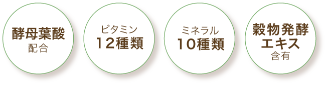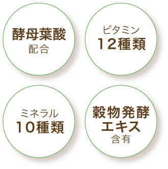 酵母(ナイアシンアミド、亜鉛、葉酸、クロム、セレン、モリブデン、V.B6、銅、マンガン含有)、穀物発酵エキス、マルトデキストリン/HPMC、貝カルシウム、酸化マグネシウム、V.C、ピロリン酸第二鉄、V.E、セルロース、デュナリエラカロチン、ステアリン酸カルシウム、V.B12、V.D、パントテン酸Ca、酸化ケイ素、V.B1、V.B2、ビオチン、(一部にゼラチン、小麦・乳成分・大豆を含む)